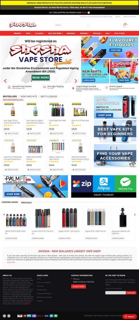 There is no surprise that Shosha is New Zealand’s best-vaping store. We have over eighty five physical stores and stock the world’s best-vaping brands, including SMOK, Vaporesso, UWELL, Geekvape, Palm Fit and so many more. At Shosha, we consistently deliver our customer's high-quality electronic cigarettes, pod vapes, starter kits, vape mods, E-liquids, and vaping accessories at the best price.
